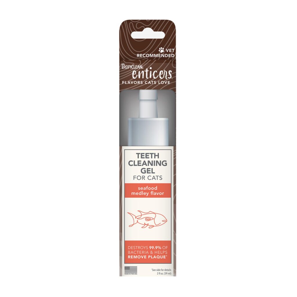 3. Gels. TropiClean Enticers gels are an easy way to clean your pet’s teeth if they are set against brushing. Applying a pearl-size drop on each side of their mouth daily and withholding water and food for 30 minutes before and after will help to break down plaque and tartar. They come in different flavors for dogs and cats
